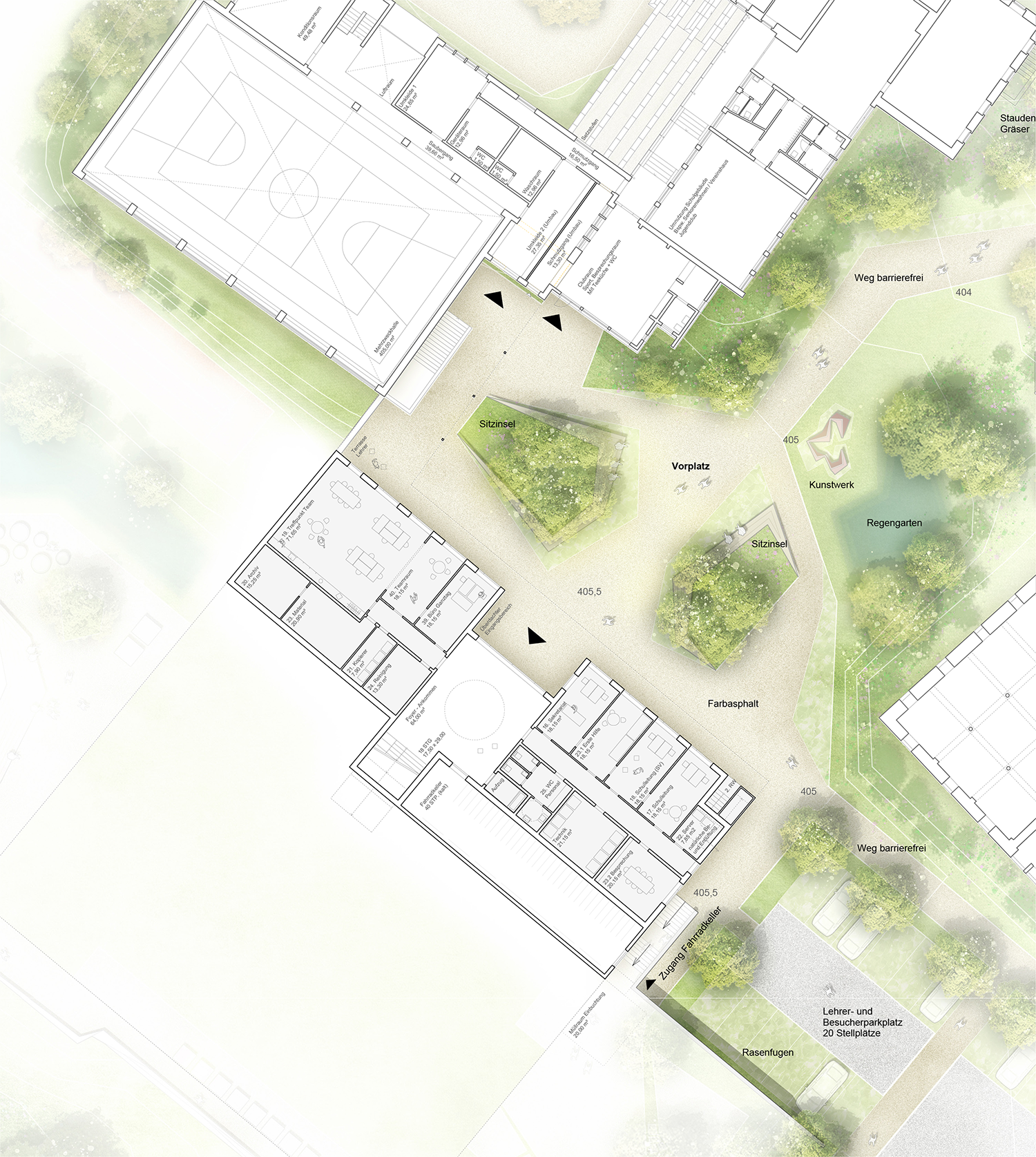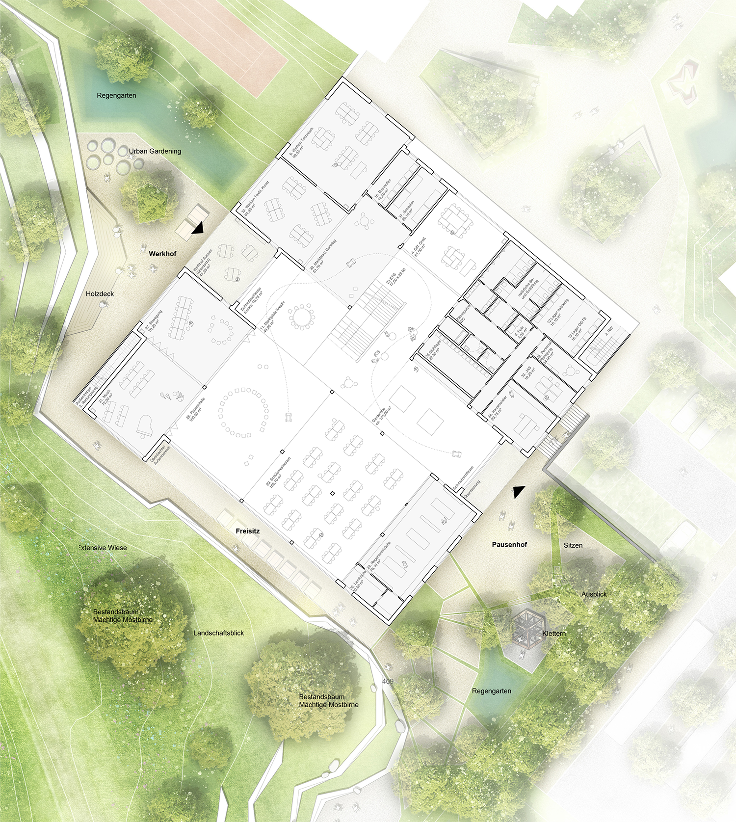 Das Konzept der Freianlagen entwickelt die vorhandene Topografie weiter und nutzt sie, um differenzierte Nutzungsbereiche mit hoher Aufenthaltsqualität zu schaffen. Die Erschließung des Gebäudes erfolgt im Osten ebenerdig mit direkter Anbindung an das Dorf. Die wichtigsten Außenräume – Pausenhof und Werkhof – liegen ein Geschoss höher auf Landschaftsniveau und orientieren sich nach Süden und Norden in die Weite.