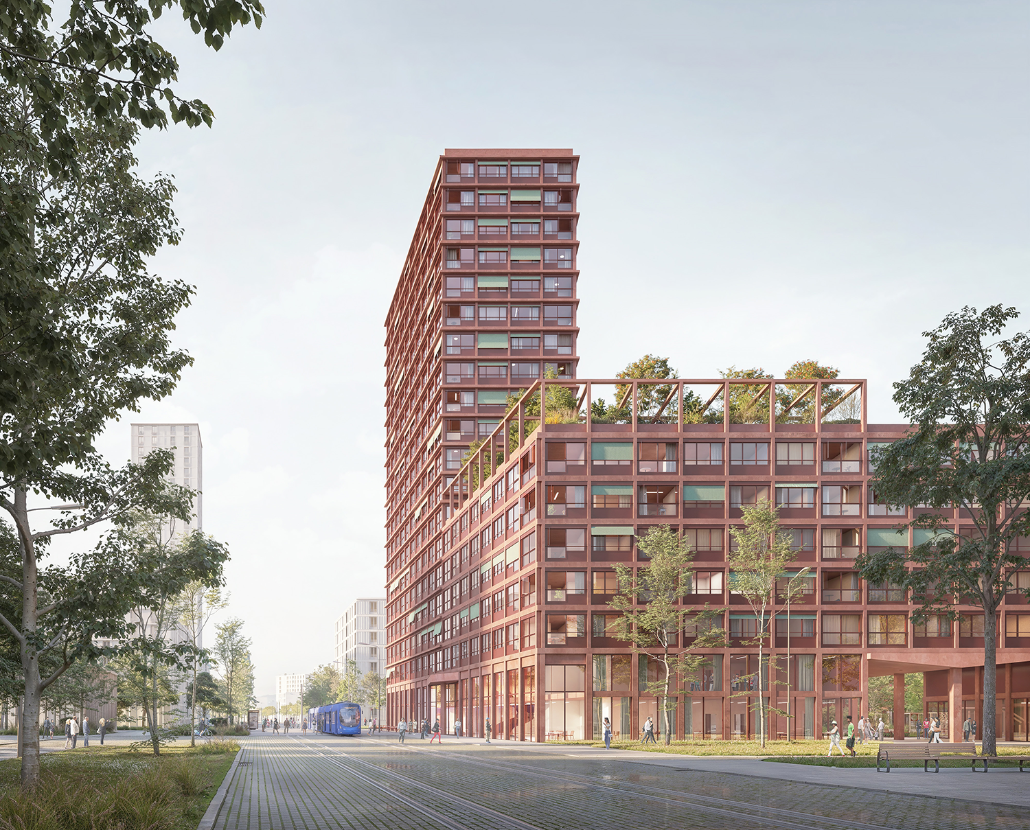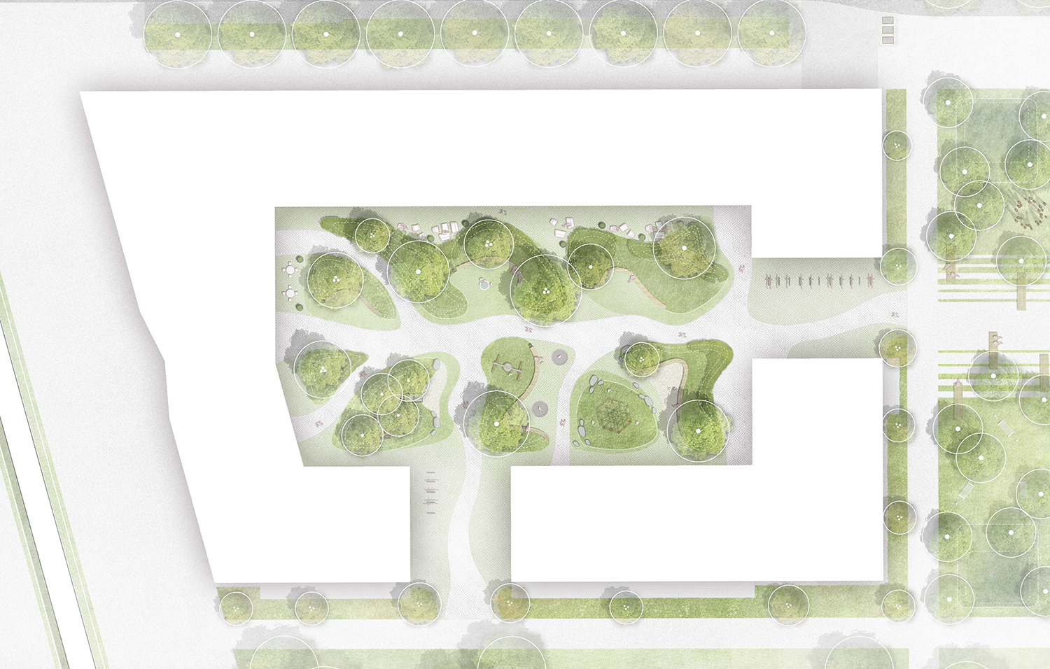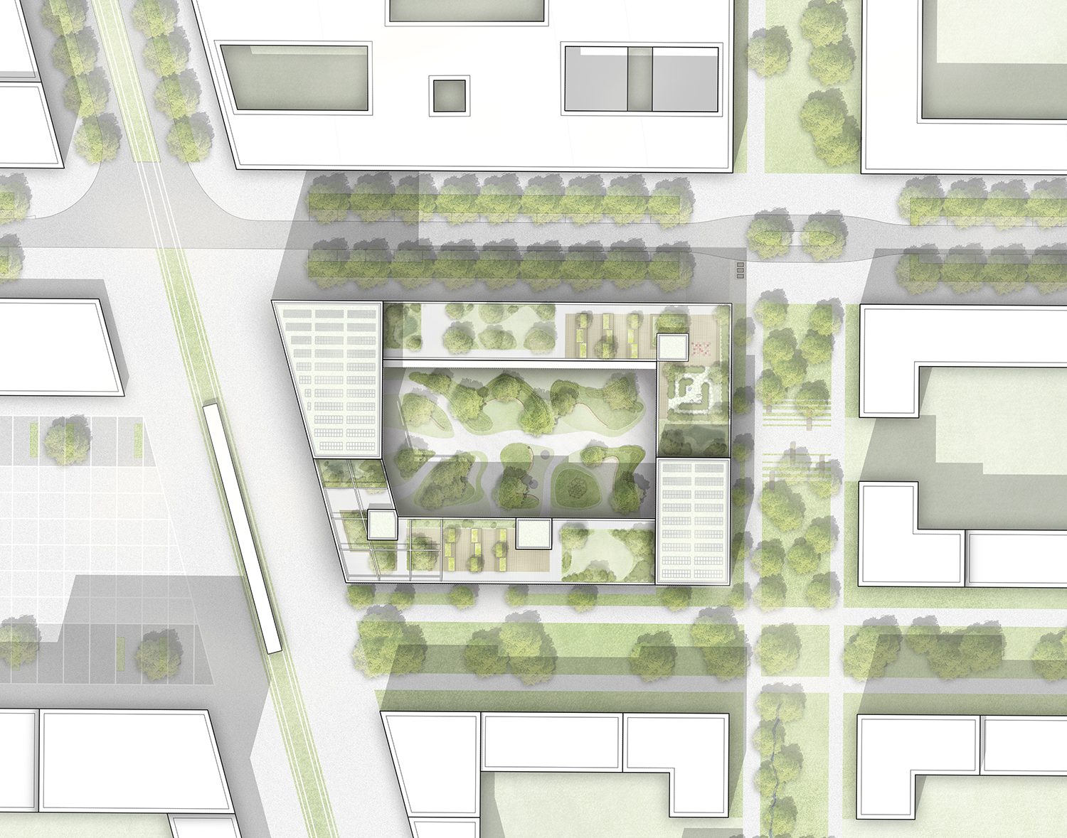 Als Reaktion auf die hohe städtebauliche Dichte bieten die Dächer wertvollen zusätzlichen Freiraum. Thematische Gärten, Urban Gardening, Spielbereiche, Lounges und Aussichtspunkte sind klar in Feldern organisiert und über einen mäandrierenden Weg verbunden. Nachhaltigkeit ist dabei integraler Bestandteil: extensive Blühflächen, Regenwasserretention und Photovoltaikmodule sind ebenso berücksichtigt wie die soziale Funktion der Dächer als Orte der Erholung.