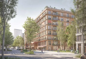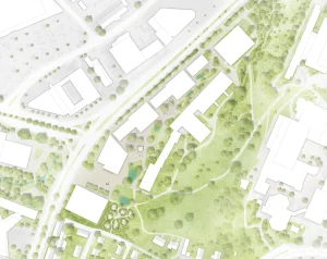 Das Konzept basiert auf der Vision eines klimaresistenten Stadtquartiers mit integrierter Wasserbewirtschaftung und urbanen Grünflächen. Durch gezielte Regenwasserretention und -Versickerungssysteme wird Niederschlag effektiv genutzt, um die städtische Überhitzung zu minimieren und die Grundwasserreserven aufzufüllen. Diese Systeme, kombiniert mit umfangreichen Verdunstungsflächen, spielen eine zentrale Rolle in der Regulierung des Mikroklimas. Die geplanten Gründächer und Fassadenbegrünung sind nicht nur visuell ansprechend, sondern bieten auch praktische Vorteile: Sie verbessern die Luftqualität, reduzieren den Energiebedarf für die Gebäudekühlung und bieten neuen Lebensraum für städtische Flora und Fauna.