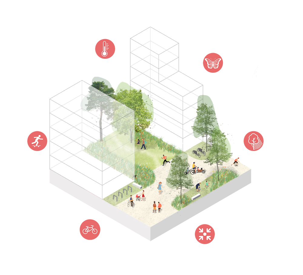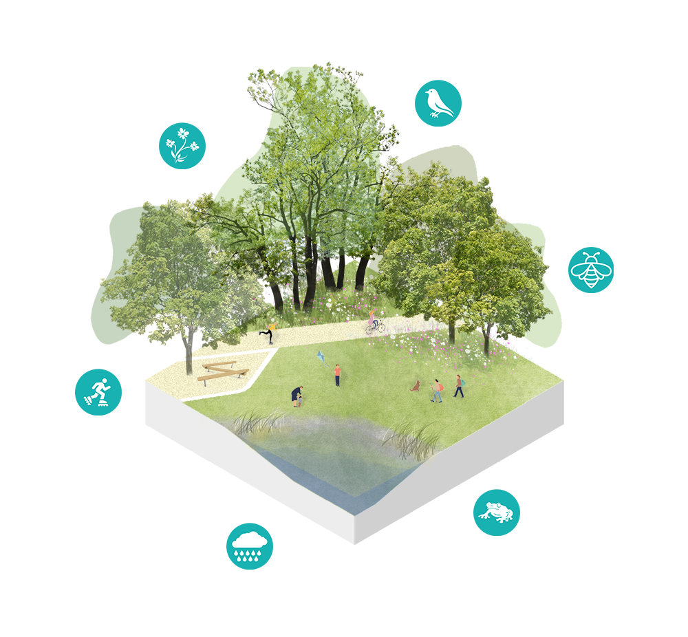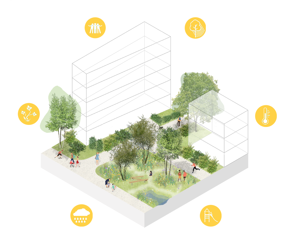 Wesentlichstes Element ist der zusammenhängende, zentrale Grünraum. Als Parktypus wird die grüne Mitte ein prägendes, Identität-stiftendes Element im städtebaulichen Gefüge. Der multifunktional gedachte Raum übernimmt unterschiedlichste Funktionen. Große Rasenflächen dienen der individuellen Aneignung. Dazu Lieblingsorte und ein umfangreiches, generationsübergreifendes Angebot an Spiel- und Erholungsflächen erzeugen ein qualitätvolles Grundgerüst und die Möglichkeit der nachbarschaftlichen Begegnung. An den Rändern des Parks unterstützen umfangreiche Großbaumpflanzung die räumliche Gestalt und sorgen für viel Schatten und mikroklimatische Verbesserungen. Zur Stärkung der Klimaresilienz dienen übergeordnete Retentionsbereiche in den Wiesenflächen als Regenrückhalt. Der so wichtigen Funktion der Durchlüftung und Kühlung des Stadtkörpers wird durch den zentralen Grünraum im hohen Maße Rechnung getragen.