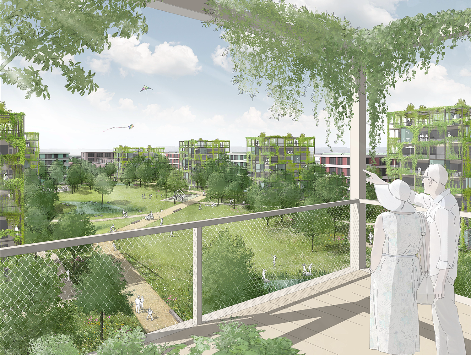 Die typologische Diversität erzeugt hinsichtlich der Geschossigkeit ein Spektrum von II – VII, wobei sich die sechs- und siebengeschossige Bebauung auf einzelne Punkte entlang des Parks beschränkt. Der Platz im Westen versteht sich als Schnittstelle zwischen dem Quartiersinnern am Park und der Ausbildung des Siedlungsrands mit Landschaftsbalkon und Biergarten. Im westlichen Bereich reduziert sich die Höhenentwicklung auf max. 4 Regelgeschosse, wobei sie sich am westlichen Siedlungsrand auf 3 Geschosse reduziert. Das neue Quartier zeichnet sich insgesamt durch eine wohldosierte Urbanität aus, welche die Komponenten Landschaftsbezug, Gemeinschaft, typologische Vielfalt, Adressbildung und Vernetzung miteinander verknüpft und hieraus eine unverwechselbare Identität entwickelt.