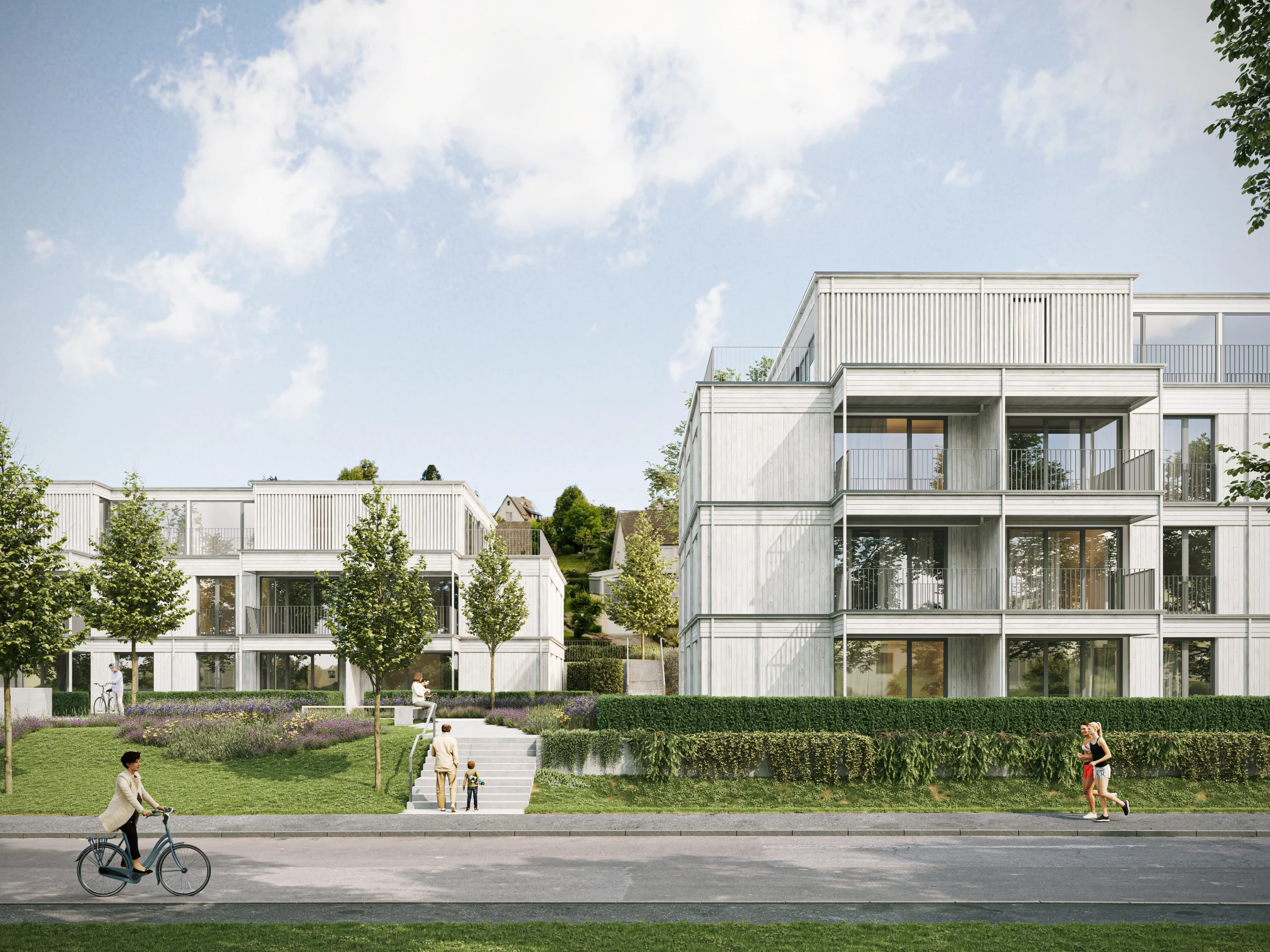Der zentrale Hofraum wird als grüner Aufenthaltsraum mit hoher Qualität ausgebildet und bewusst frei von ruhendem Verkehr gehalten. Artenreiche Blühwiesen und Pflanzflächen mit heimischen Sträuchern prägen die Freiflächen, fördern die Biodiversität und ermöglichen zugleich eine pflegeextensive Gestaltung. Ergänzend tragen extensiv begrünte Dachflächen zur ökologischen Aufwertung des Projekts bei, verbessern das Mikroklima und leisten einen wichtigen Beitrag zur Regenwasserrückhaltung.