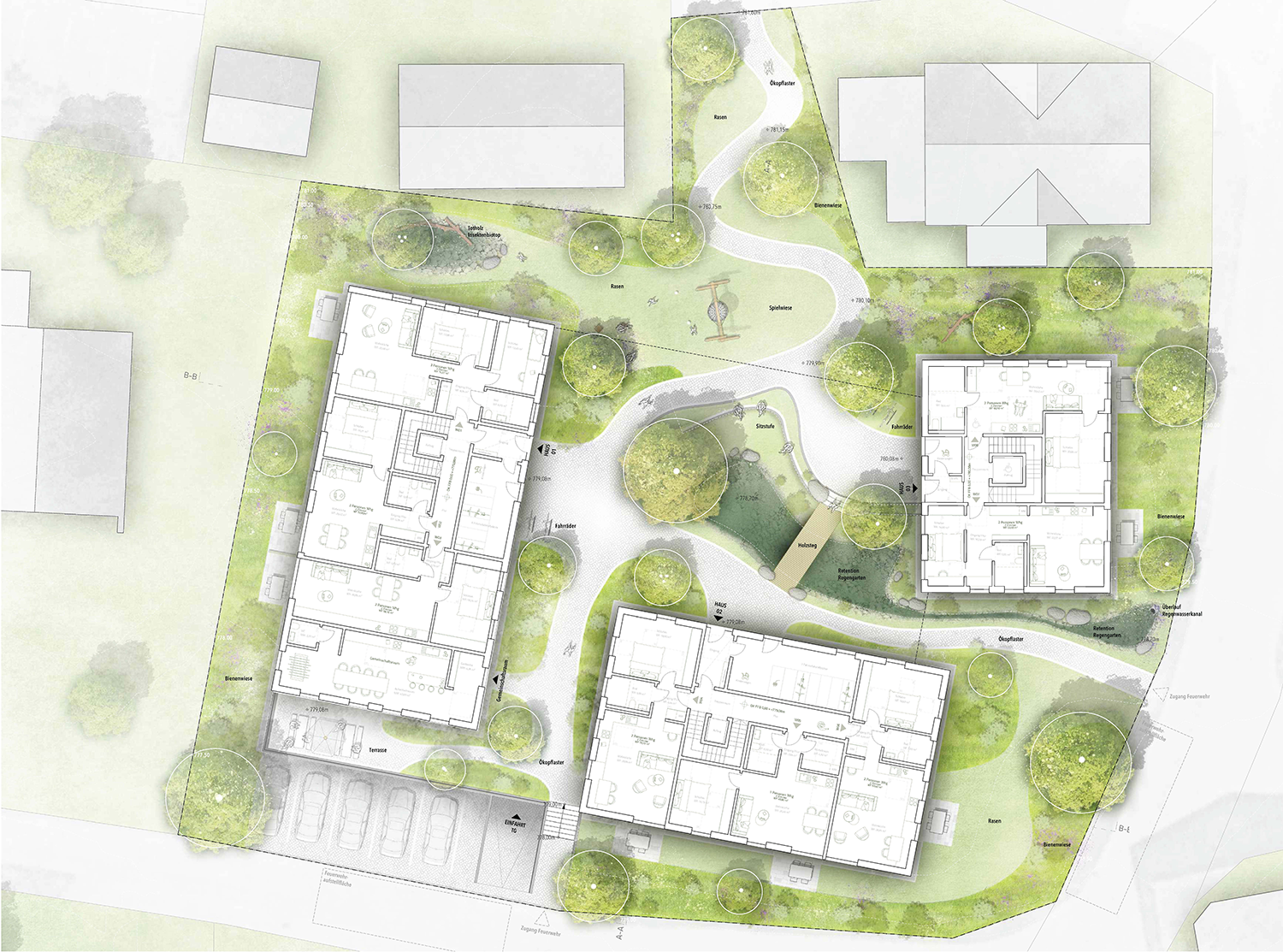 Um das notwendige Rückhaltevolumen sicherzustellen und eine harmonische Einbindung der Gebäude in das Gelände zu ermöglichen, wird das Grundstück terrassiert. Diese Maßnahme erzeugt zugleich einen natürlichen Höhenversatz nach Süden – die Einfahrt zur Tiefgarage wird so elegant integriert. Üppig begrünte Böschungen fassen das Gelände, stärken die Adressbildung und wirken als grüne Kulisse entlang der Straße.