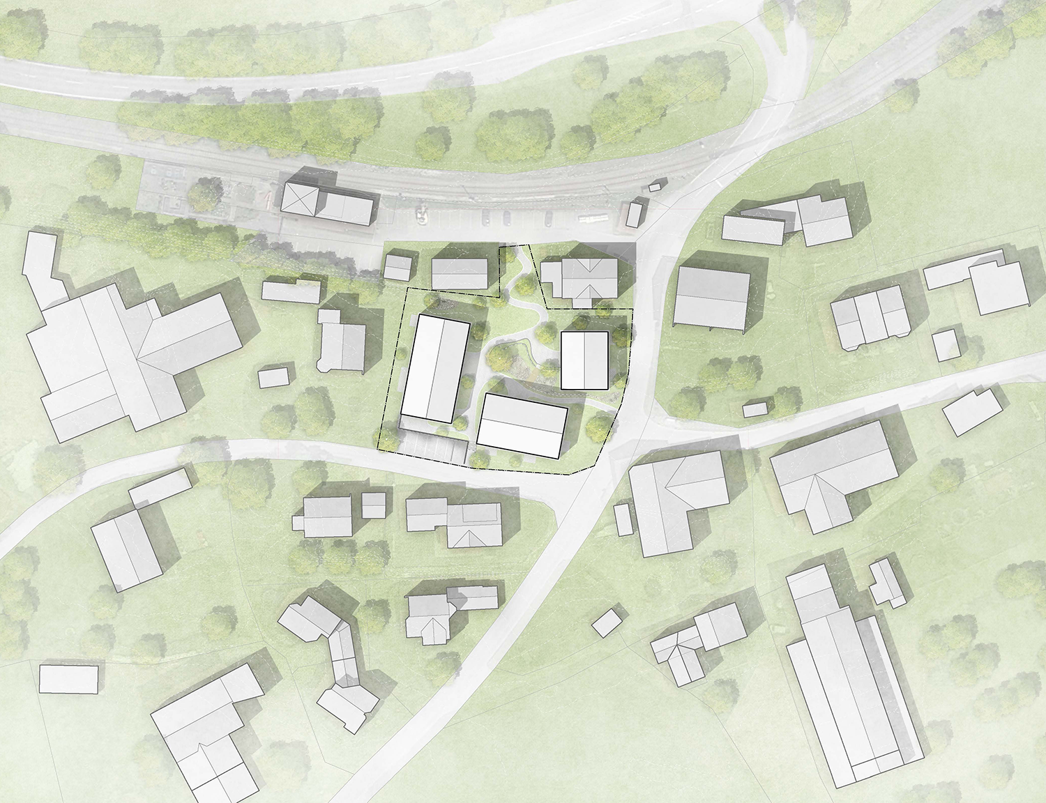Der Freiraum der neuen Hofgruppe basiert auf einer klaren Gliederung typologischer Einheiten, die sich präzise auf die jeweilige Nutzung und topografische Situation beziehen. Im Zentrum entsteht ein großzügiger, atmosphärisch dichter Innenhof – Aufenthalts-, Spiel- und Kommunikationsraum für alle Generationen.