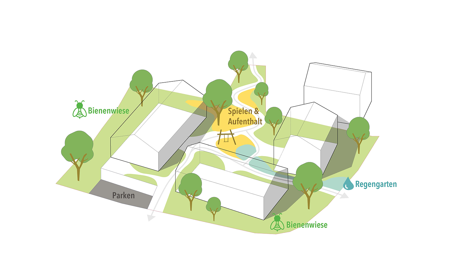 Das Freiraumkonzept verknüpft funktionale Anforderungen mit ökologischer Sensibilität und gestalterischer Qualität. Es entstehen robuste, resiliente Räume mit hoher Aufenthaltsqualität, die sowohl den Wandel des Klimas als auch das Bedürfnis nach sozialem Miteinander adressieren. Architektur und Landschaft bilden eine starke Einheit – für eine lebenswerte, zukunftsfähige Nachbarschaft.