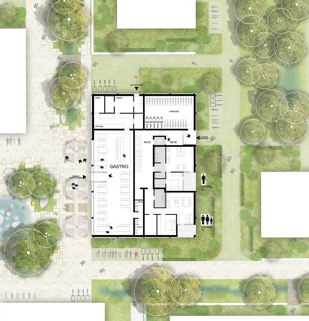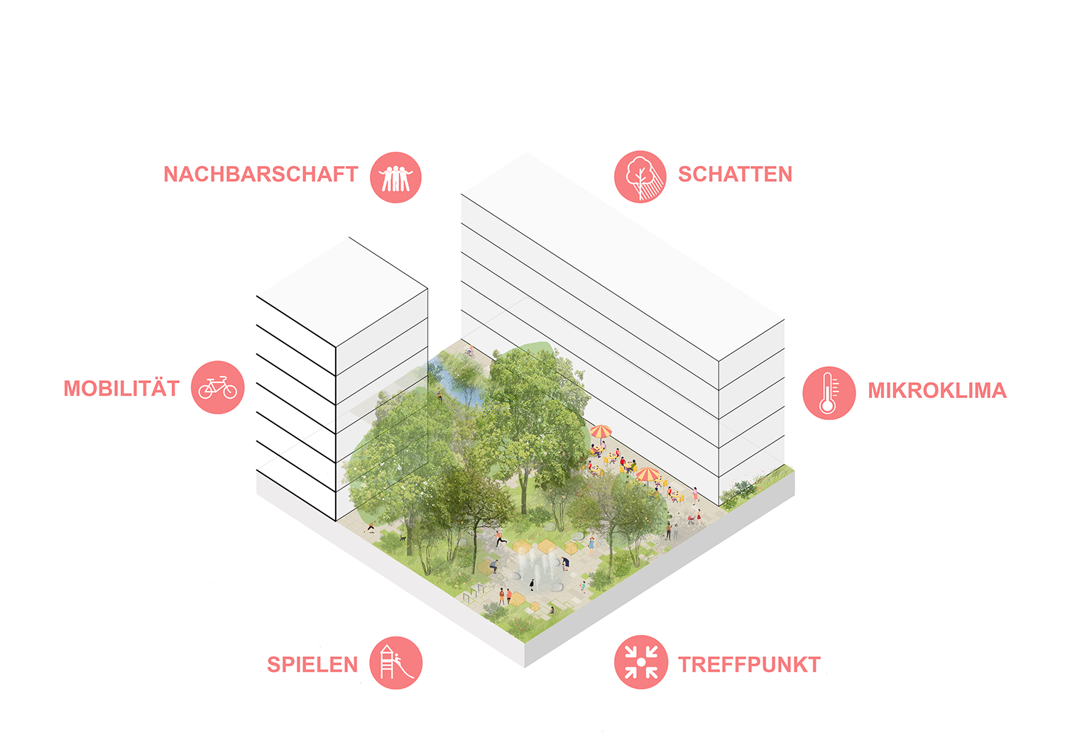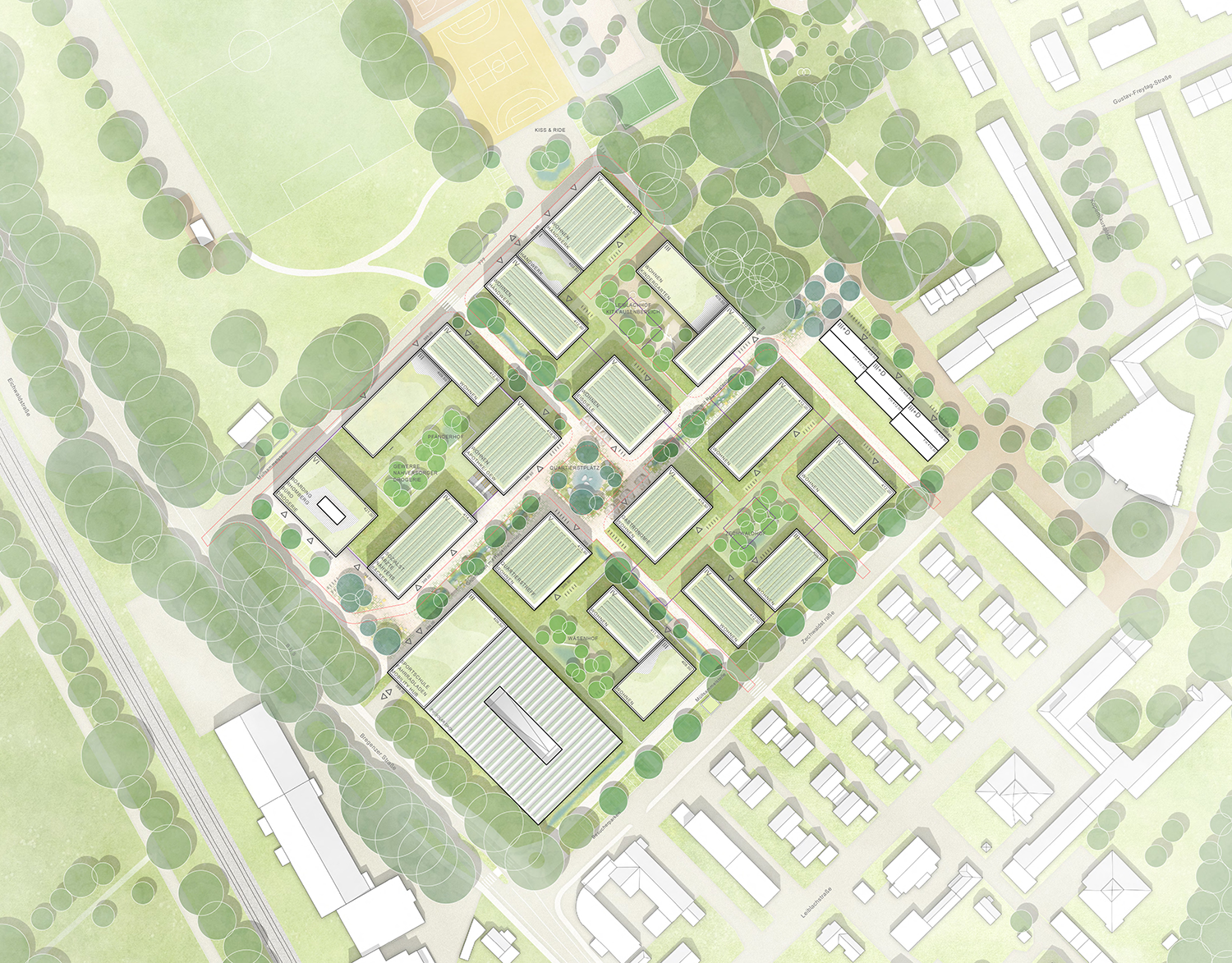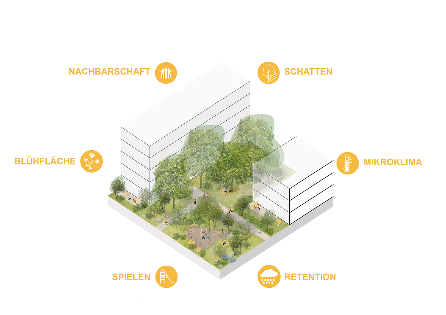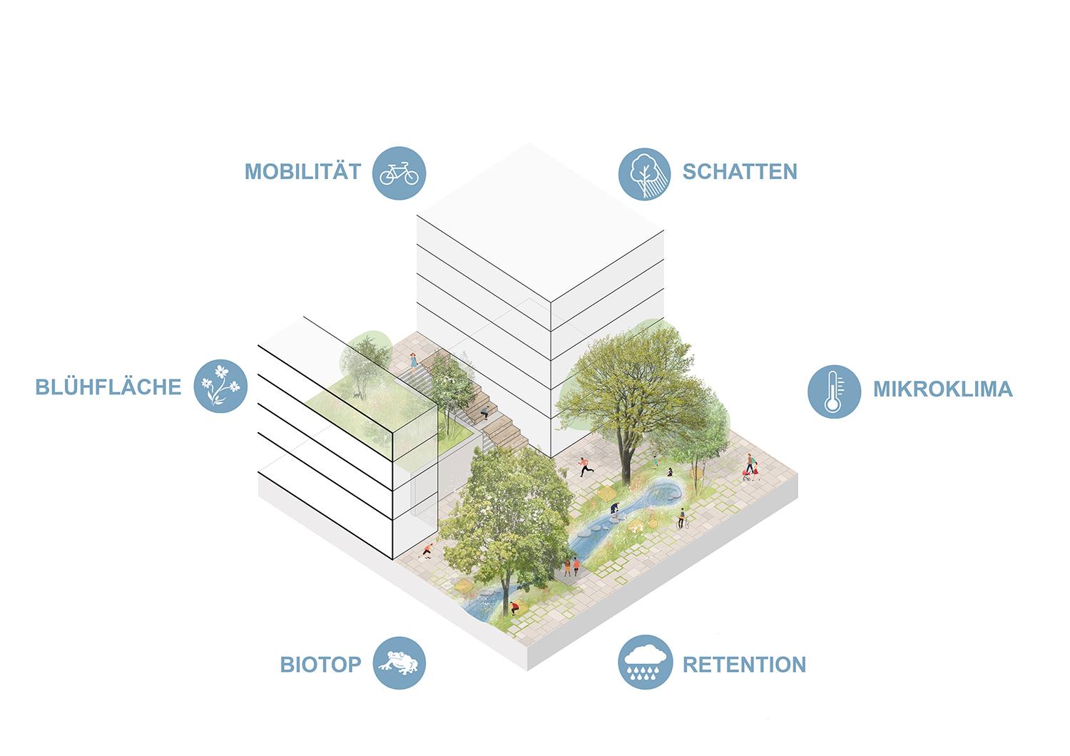 Wesentlichstes Element ist die zusammenhängende, zentrale Platzabfolge, die als grüner und zugleich urbaner Baustein zum prägenden, Identität-stiftenden Kontinuum im städtebaulichen Gefüge wird. Der multifunktional gedachte Raum übernimmt unterschiedlichste Funktionen. Rasenflächen dienen der individuellen Aneignung. Dazu Lieblingsorte und ein Angebot an Spiel- und Erholungsflächen erzeugen ein qualitätvolles Grundgerüst und die Möglichkeit der nachbarschaftlichen Begegnung. Umfangreiche Großbaumpflanzung sorgen für viel Schatten und mikroklimatische Verbesserungen. Zur Stärkung der Klimaresilienz dienen übergeordnete Retentionsbereiche als Regenrückhalt. Der so wichtigen Funktion der Durchlüftung und Kühlung des Stadtkörpers wird durch den zentralen Freiraum im hohen Maße Rechnung getragen.